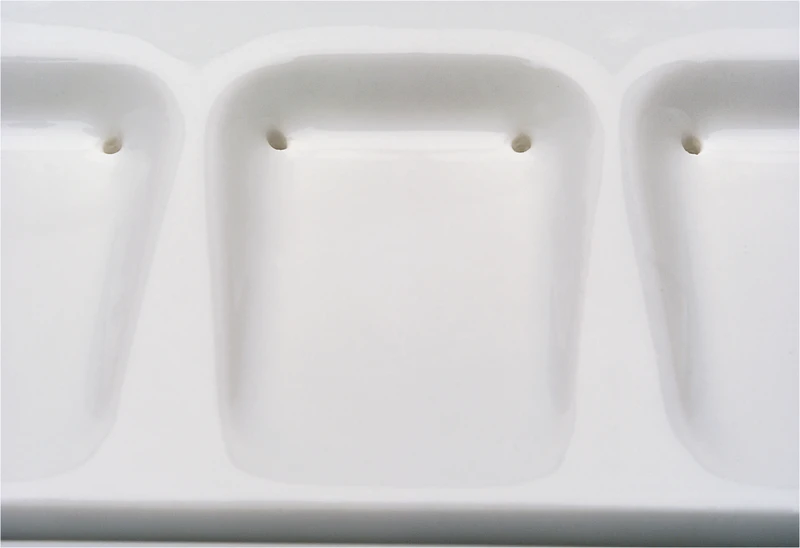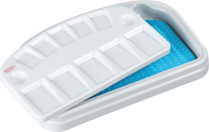 Keramikmischplatte mit Feuchthaltesystem. Die Mulden werden über ein Kapillarsystem mit Feuchtigkeit versorgt. Zusätzlich verhindert ein transparenter Kunststoffdeckel das Austrocknen und Verstauben der Keramikmasse.
