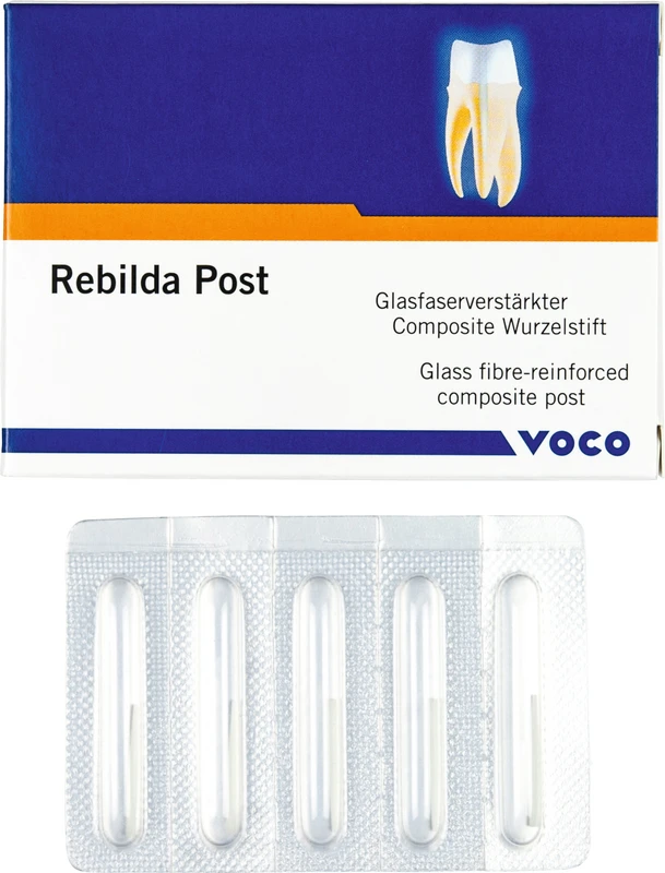 Mit dem neuen glasfaserverstärkten Composite Wurzelstift Rebilda® Post bringt VOCO eine hervorragende Ergänzung zum dualhärtenden Stumpfaufbau- und Befestigungsmaterial Rebilda® DC (siehe Kapitel 6). Der röntgenopake, transluzente Rebilda® Post mit dentinähnlichem Elastizitätsverhalten führt durch Adhäsivtechnik zu einer dauerhaften und ästhetisch hochwertigen, metallfreien Restauration.
