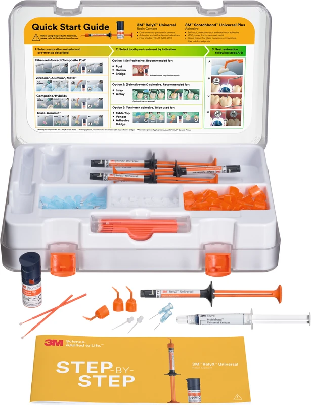 3M RelyX Universal Befestigungskomposit kann alleine als selbstadhäsiver Befestigungszement und in Kombination mit 3M ScotchbondUniversal Plus Adhäsiv für die adhäsive Befestigung eingesetzt werden. Durch die gemeinsame Verwendung entfällt das aufwendige und umständliche Arbeiten mit mehreren Befestigungskompositen, Primern und Adhäsiven. Das vereinfacht Ihre direkten und indirekten Workflows in der restaurativen Zahnheilkunde. Sie müssen weniger Produkte lagern und nachfüllen und sparen so Platz, Zeit und Geld.