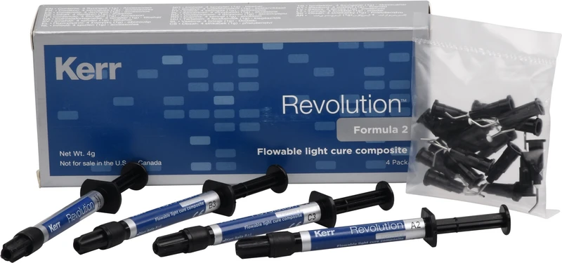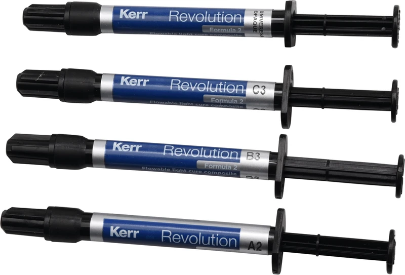 Lichthärtendes, fließfähiges Hybrid-Komposit für Klasse III, IV und V Restaurationen. 60 Gewichts-% gefüllt mit 0,6 U/min Partikelgröße. Weiter eignet sich Revolution Formula 2 für die Verarbeitung von Keramik-Inserts.