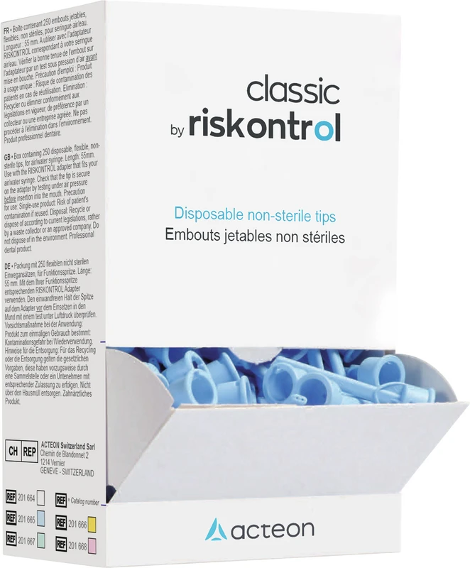RISKONTROL® ist zusammen gesetzt aus einem Adapter aus eloxiertem Aluminium und auswechselbaren Einwegansätzen aus Kunststoffmaterial ohne Memoryeffekt. Der Kunststoffansatz ist nicht Wärme leitfähig, deshalb wird ein Wärmeaustausch zwischen Ansatz und Zahn vermieden.