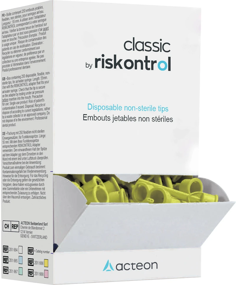RISKONTROL® ist zusammen gesetzt aus einem Adapter aus eloxiertem Aluminium und auswechselbaren Einwegansätzen aus Kunststoffmaterial ohne Memoryeffekt. Der Kunststoffansatz ist nicht Wärme leitfähig, deshalb wird ein Wärmeaustausch zwischen Ansatz und Zahn vermieden.