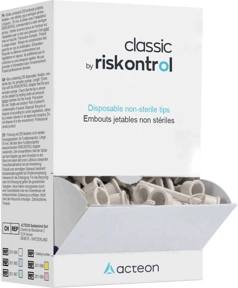 RISKONTROL® ist zusammen gesetzt aus einem Adapter aus eloxiertem Aluminium und auswechselbaren Einwegansätzen aus Kunststoffmaterial ohne Memoryeffekt. Der Kunststoffansatz ist nicht Wärme leitfähig, deshalb wird ein Wärmeaustausch zwischen Ansatz und Zahn vermieden.