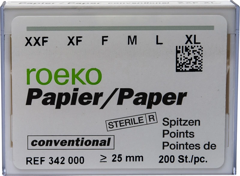 Mit deutlich ausgeprägtem konischem Formverlauf eignen sich Roeko Papierspitzen conventional hervorragend zur Trocknung konventionell aufbereiteter Wurzelkanäle.