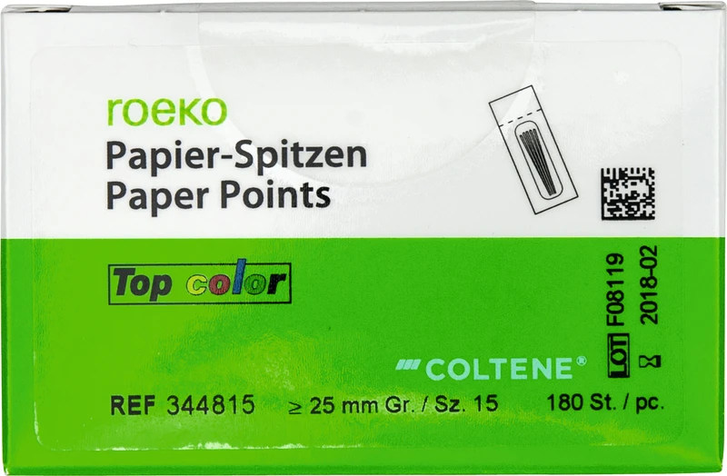 roeko Top color Papier-Spitzen verbinden die Vorteile der weissen und der ganz eingefärbten Spitzen (color). Die Teilfarbkodierung verhindert die Verwechslung von verschiedenen Größen. Die weiße Spitze erleichtert die Kontrolle der Wurzelkanalreinigung.