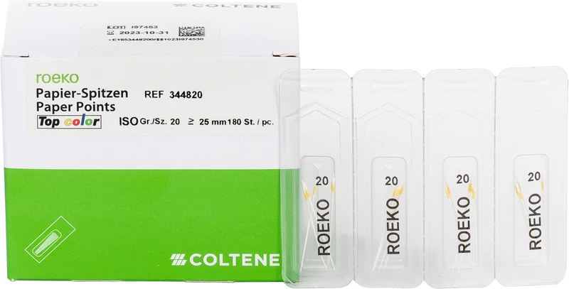 roeko Top color Papier-Spitzen verbinden die Vorteile der weissen und der ganz eingefärbten Spitzen (color). Die Teilfarbkodierung verhindert die Verwechslung von verschiedenen Größen. Die weiße Spitze erleichtert die Kontrolle der Wurzelkanalreinigung.