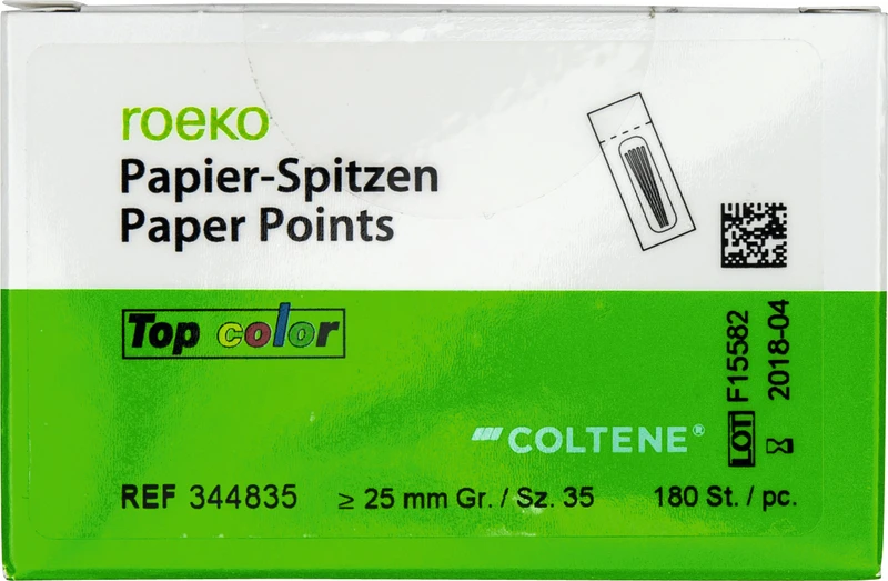 roeko Top color Papier-Spitzen verbinden die Vorteile der weissen und der ganz eingefärbten Spitzen (color). Die Teilfarbkodierung verhindert die Verwechslung von verschiedenen Größen. Die weiße Spitze erleichtert die Kontrolle der Wurzelkanalreinigung.