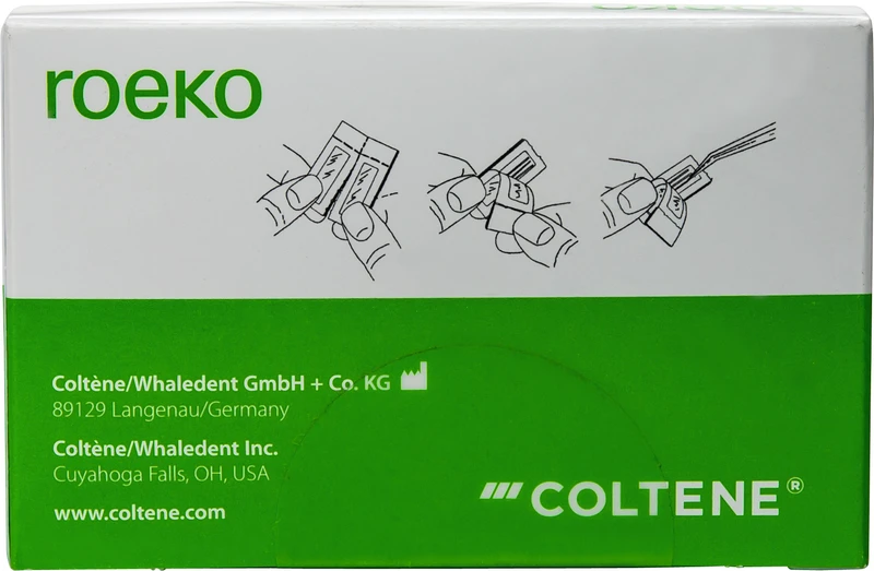 roeko Top color Papier-Spitzen verbinden die Vorteile der weissen und der ganz eingefärbten Spitzen (color). Die Teilfarbkodierung verhindert die Verwechslung von verschiedenen Größen. Die weiße Spitze erleichtert die Kontrolle der Wurzelkanalreinigung.