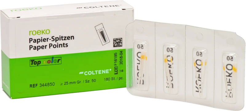 roeko Top color Papier-Spitzen verbinden die Vorteile der weissen und der ganz eingefärbten Spitzen (color). Die Teilfarbkodierung verhindert die Verwechslung von verschiedenen Größen. Die weiße Spitze erleichtert die Kontrolle der Wurzelkanalreinigung.
