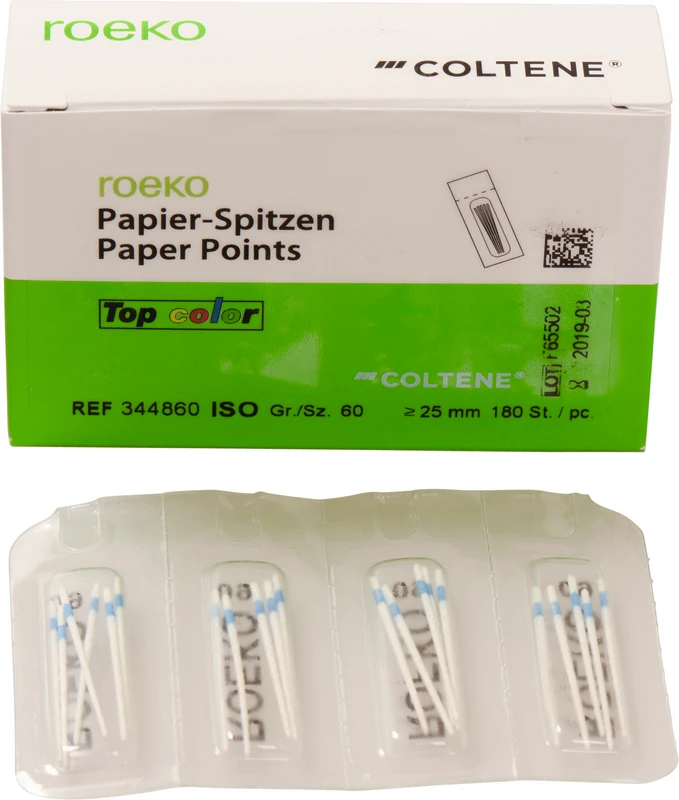 roeko Top color Papier-Spitzen verbinden die Vorteile der weissen und der ganz eingefärbten Spitzen (color). Die Teilfarbkodierung verhindert die Verwechslung von verschiedenen Größen. Die weiße Spitze erleichtert die Kontrolle der Wurzelkanalreinigung.