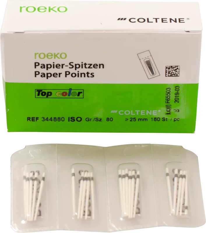 roeko Top color Papier-Spitzen verbinden die Vorteile der weissen und der ganz eingefärbten Spitzen (color). Die Teilfarbkodierung verhindert die Verwechslung von verschiedenen Größen. Die weiße Spitze erleichtert die Kontrolle der Wurzelkanalreinigung.