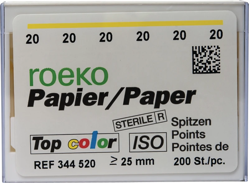 roeko Top color Papier-Spitzen verbinden die Vorteile der weissen und der ganz eingefärbten Spitzen (color). Die Teilfarbkodierung verhindert die Verwechslung von verschiedenen Größen. Die weiße Spitze erleichtert die Kontrolle der Wurzelkanalreinigung.