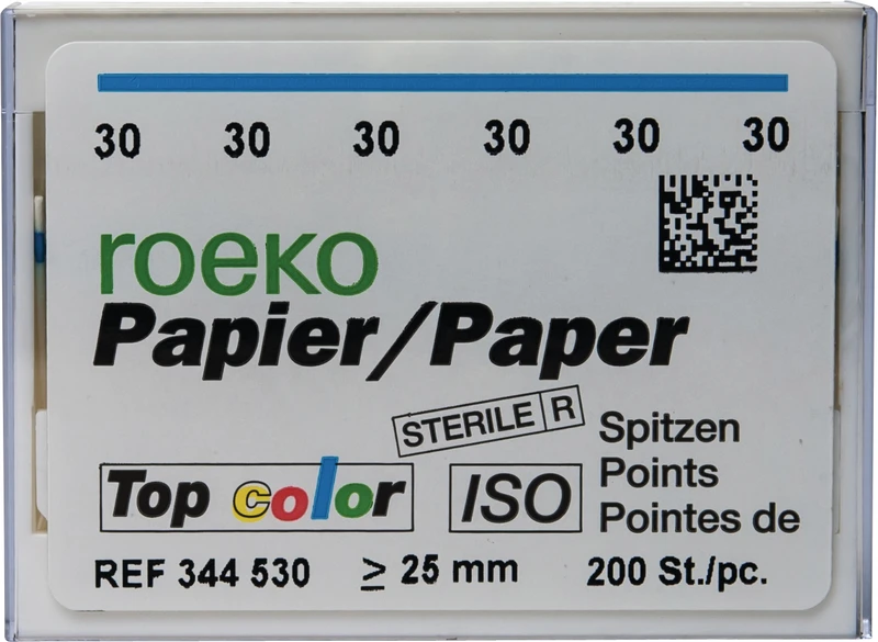 roeko Top color Papier-Spitzen verbinden die Vorteile der weissen und der ganz eingefärbten Spitzen (color). Die Teilfarbkodierung verhindert die Verwechslung von verschiedenen Größen. Die weiße Spitze erleichtert die Kontrolle der Wurzelkanalreinigung.