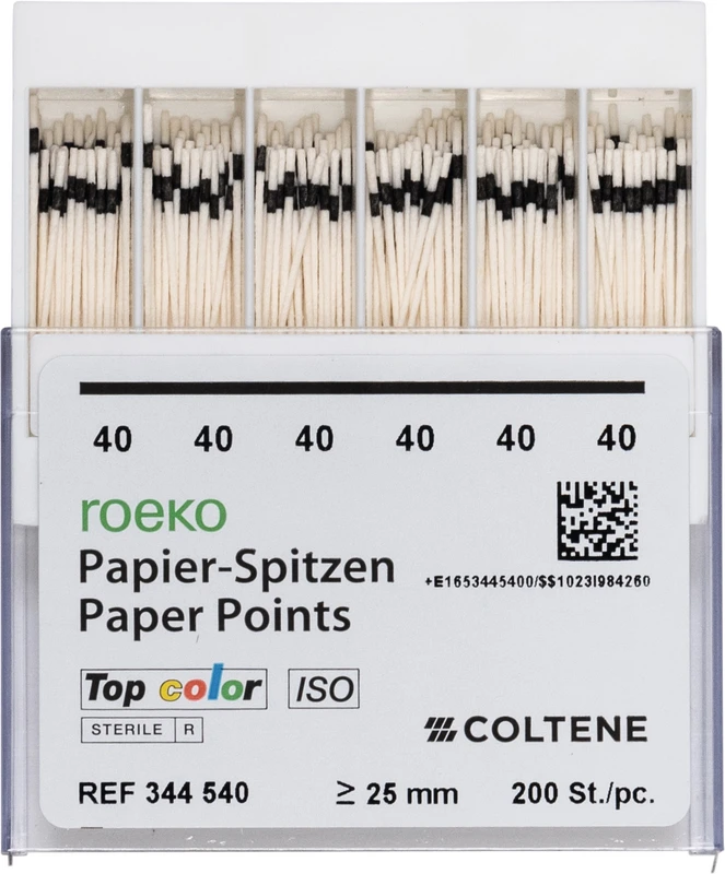roeko Top color Papier-Spitzen verbinden die Vorteile der weissen und der ganz eingefärbten Spitzen (color). Die Teilfarbkodierung verhindert die Verwechslung von verschiedenen Größen. Die weiße Spitze erleichtert die Kontrolle der Wurzelkanalreinigung.