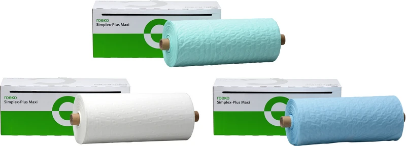 PE-Folie mit absorbierender Zellstoffvliesauflage mit Abrissperforation auf der Rolle, extra breit. Optimaler Schutz der Patientenkleidung.
