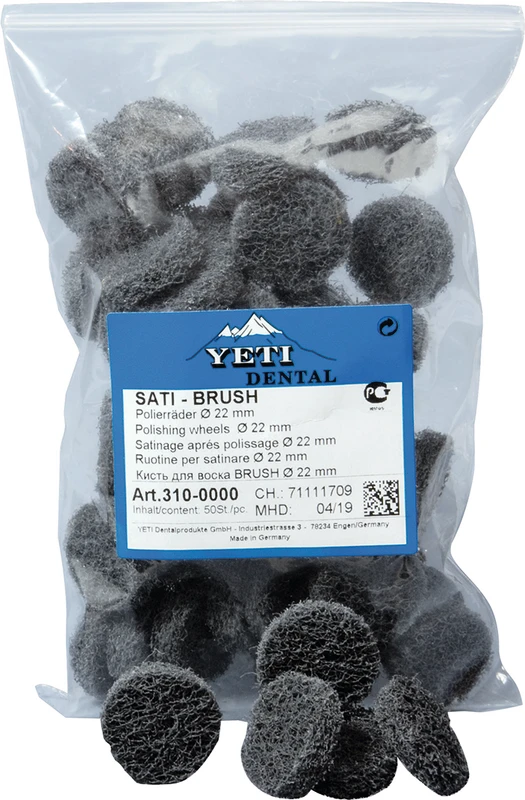 Ein matter Glanz auf der Kaufläche zeigt eventuelle Störkontakte nach kurzer Tragezeit im Mund als glänzende Stellen. Dadurch sichtbar gemacht, können diese problemlos beseitigt werden. SATI BRUSH wird nach dem Polieren der Kaufläche angewendet, wobei es langsam rotierend die Kaufläche mattiert. Ebenso kann SATI BRUSH zum Beseitigen von Oxydschichten auf Metalloberflächen verwendet werden.