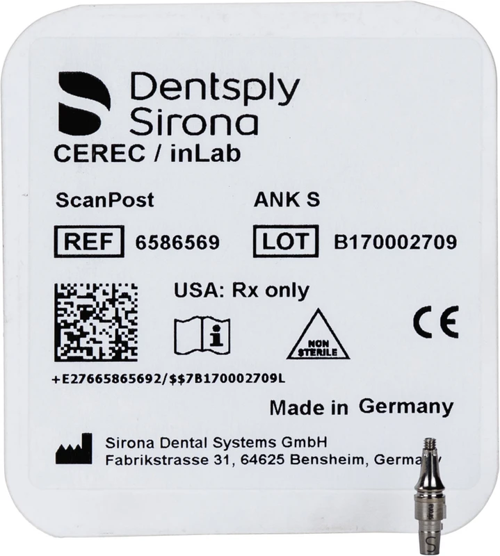 ScanPost ist zusammen mit einem geeignetem Scanbody ein Hilfsmittel zur intraoralen optischen Erfassung der Implantatlage. Eine konventionelle Abformung mittels Abformpfosten zur Übertragung in ein Gipsmodell wird damit überflüssig. ScanPost ist für verschiedene Implantatsysteme- und durchmesser erhältlich und kann bis zu 50 Mal angewandt werden. Je nach eingesetztem Kamerasystem sind separat erhältliche Scanbodies zu verwenden (Scanbodies für Omnicam oder Scanbodies for Bluecam). Für die definitive Versorgung ist eine TiBase mit der gleichen Namensextension zu verwenden.