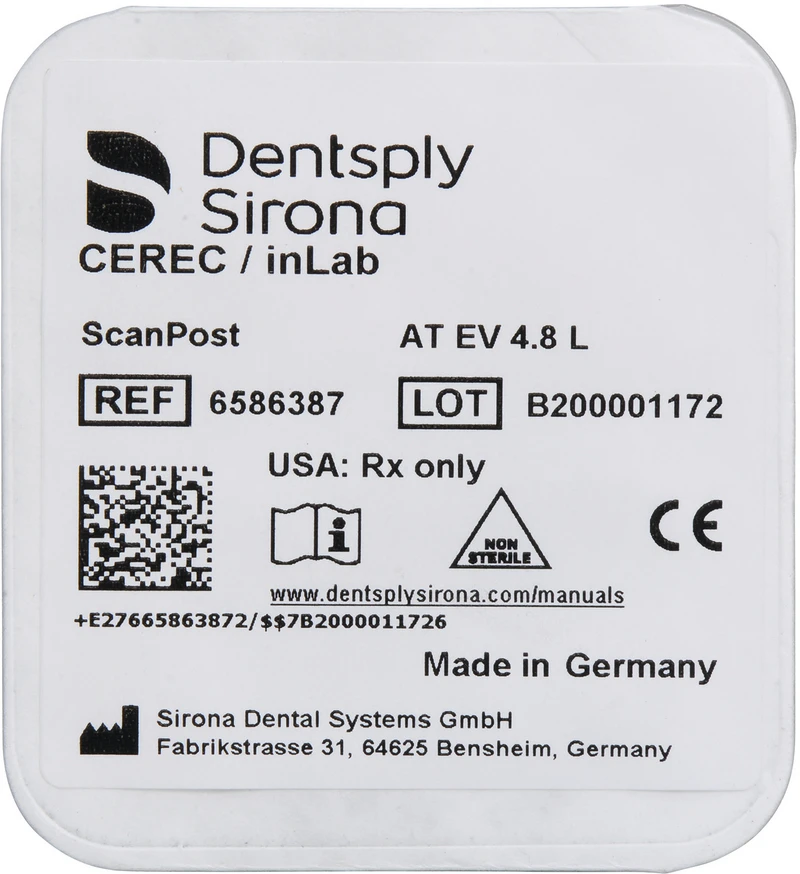 ScanPost ist zusammen mit einem geeignetem Scanbody ein Hilfsmittel zur intraoralen optischen Erfassung der Implantatlage. Eine konventionelle Abformung mittels Abformpfosten zur Übertragung in ein Gipsmodell wird damit überflüssig. ScanPost ist für verschiedene Implantatsysteme- und durchmesser erhältlich und kann bis zu 50 Mal angewandt werden. Je nach eingesetztem Kamerasystem sind separat erhältliche Scanbodies zu verwenden (Scanbodies für Omnicam oder Scanbodies for Bluecam). Für die definitive Versorgung ist eine TiBase mit der gleichen Namensextension zu verwenden.