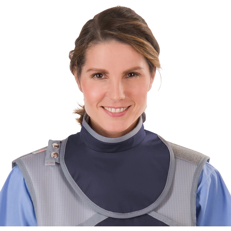 Die Schilddrüse ist ein strahlenempfindliches und daher besonders schutzwürdiges Organ des menschlichen Körpers. Das Tragen eines entsprechenden Schutzes bei dosisintensiven Untersuchungen sollte somit immer eine Selbstverständlichkeit sein. Unsere Variante des Schilddrüsen-Sternumschutzes zeichnet sich durch erstklassige Schnittführung und beste Passform aus, selbstverständlich unter Berücksichtigung aller Strahlenschutzaspekte. Standardmäßig mit fest angenähtem Klettverschluss im Nacken ausgestattet, ist der Schilddrüsen-Sternumschutz optional auch mit austauschbarem Klettverschluss oder mit praktischem Magnetverschluss erhältlich.