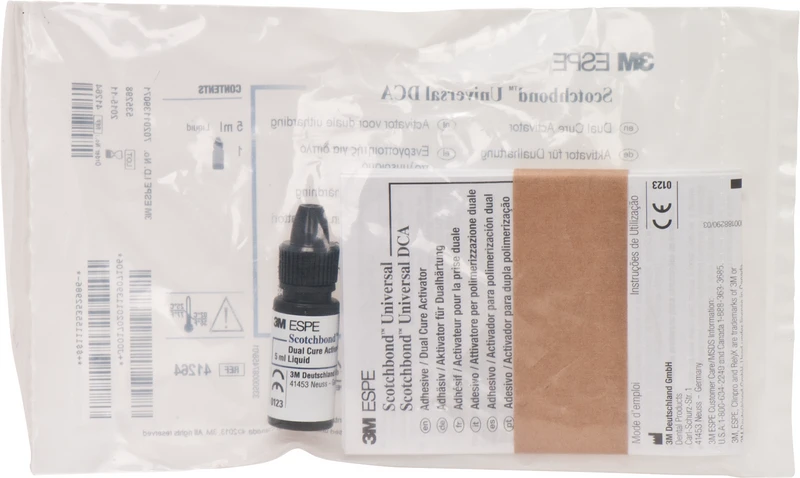 - In Verbindung mit 3M Scotchbond Universal Adhäsiv dient der Aktivator (DCA) als Co-Initiator in dual- und selbsthärtenden Befestigungssystemen sowie Stumpfaufbaumaterialien bei Abwesenheit von Licht