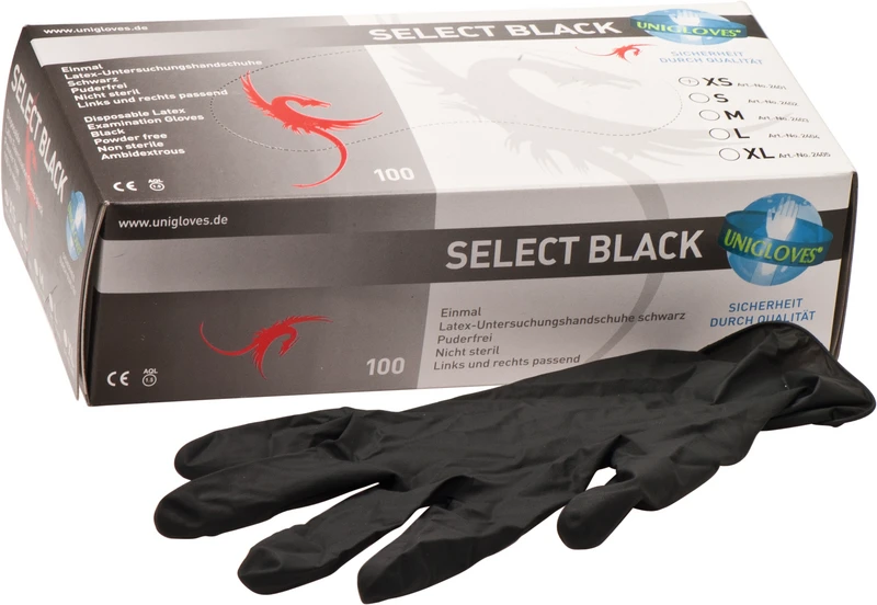 Unsterile, puderfreie SELECT® BLACK Latexhandschuhe mit Rollrand.
