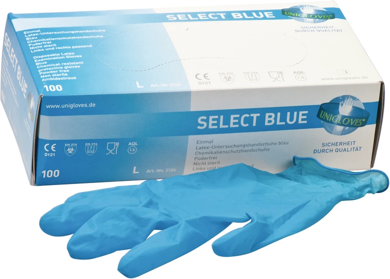Unsterile, puderfreie SELECT® BLUE Latexhandschuhe mit Rollrand.