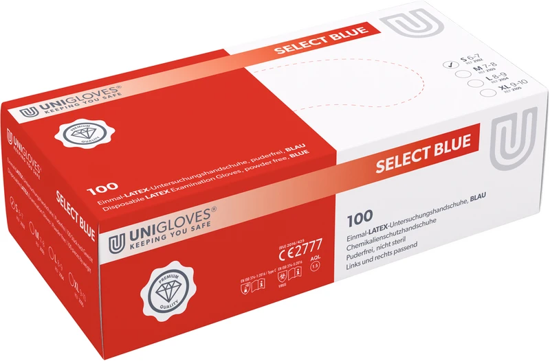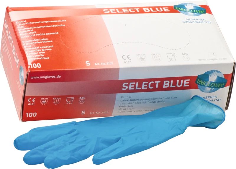 Unsterile, puderfreie SELECT® BLUE Latexhandschuhe mit Rollrand.
