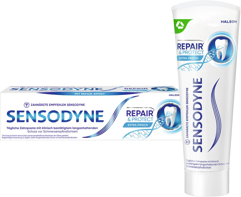 SENSODYNE® REPAIR & PROTECT kann die angreifbaren Stellen der Zähne reparieren. Bildet eine (zinnhaltige) Schutzschicht auf dem freiliegenden Dentin. Repariert dauerhaft die schmerzempfindlichen Bereiche und verhindert die Reizweiterleitung. Langanhaltender Schutz vor Schmerzempfindlichkeit und Schmerzlinderung. Klinisch geprüft. Bietet alle Vorteile einer täglichen Zahnpasta.
