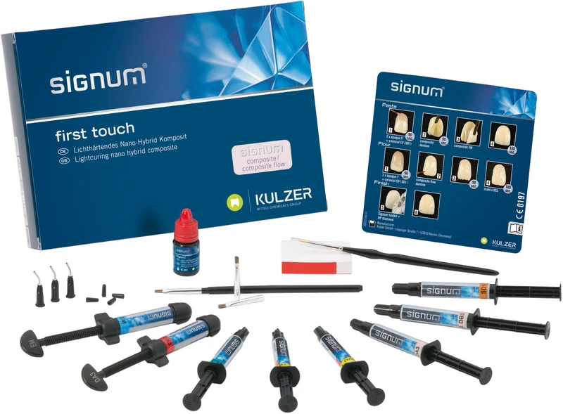 First touch Set bestehend aus: 2 x 4 g Paste composite flow (A3, B3), 4 g Paste composite (A3), 2 x 3 g Paste opaque F (A3, B3) 4 g Paste enamel (EM), 4 g Paste matrix opal scheide (OS3), 4 g Paste matrix sekundär dentin (SD1), 4 ml Signum liquid, 1 Anmischblock, 1 Opakerpinsel, 1 Modellierpinsel, Zubehör