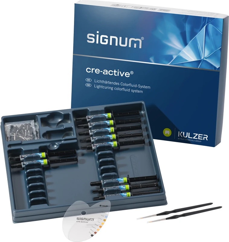 Mit unseren Signum cre-active® Malfarben erzielen Sie individuelle Charakterisierungen. Das vielfältige Farbangebot der Signum cre-active Colorfluids erlaubt Ihnen, Restaurationen perfekt an die Nachbarzähne anzugleichen. Die Colorfluids werden direkt auf die ausgehärtete Kompositoberfläche aufgetragen und polymerisiert. Signum cre-active ist das Kreativmodul zum Charakterisieren und hilft Ihnen beim Einlegen von markanten Details wie Kalkflecken, Schmelzrissen, Alterungen oder Abrasionseffekten. Signum cre-active® rundet die Verarbeitung mit den Signum Verblendmaterialien Signum composite, Signum ceramis und Signum matrix kompatibel ab. Modifikationen von Prothesenzähnen sind ebenfalls möglich.