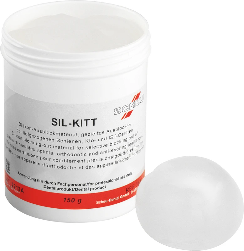 Dauerplastisches, transparentes Silikonmaterial speziell zum Ausblocken bei tiefgezogenen Schienen, Schnarchtherapiegeräten und KFO-Apparaturen.