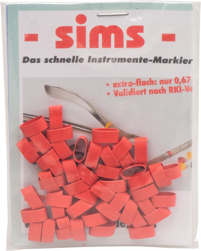 Sims, Standardgröße für Hand-Instrumente (Schrumpfvermögen: von 6,4 auf 3,2 mm Durchmesser). Das schnelle Instrumenten-Markier-System.Ringe über die Instrumente schieben und erhitzen, Ringe schrumpfen in Sekundenschnelle fest auf.Die Instrumente mit den Sims-Ringen zum Aufschrumpfen 3 - 4 Minuten in einen Heißluftsterilisator oder auch in einen sehr heißen Backofen legen. Für Metallinstrumente Mindesttemperatur: 150°C (Maximal 280°C).
