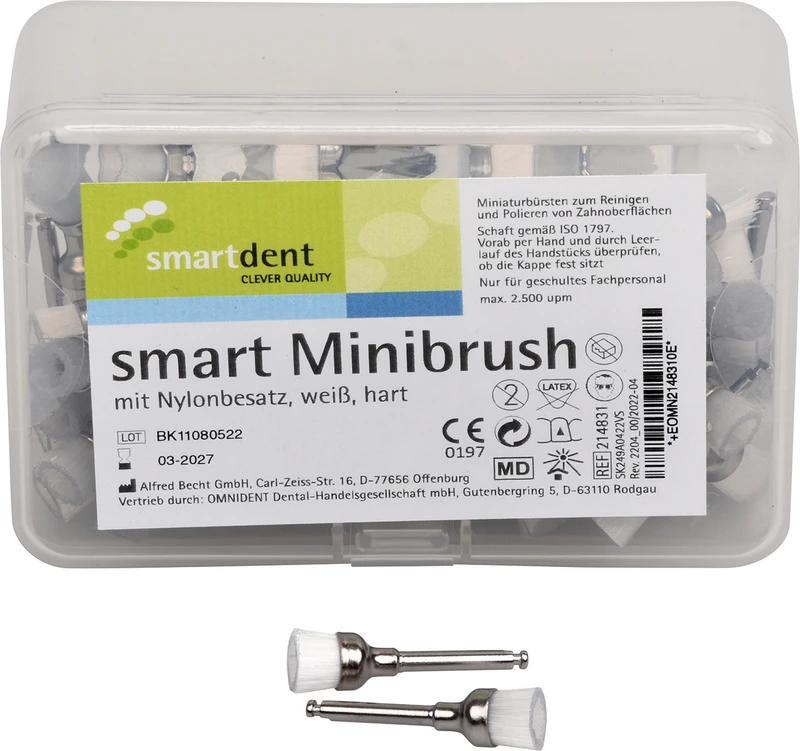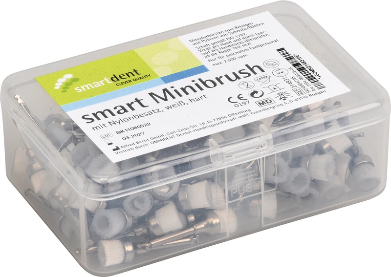 Die smart Minibrush mit Nylonborsten sind Prophylaxebürsten für die Reinigung und Politur von Zahnoberflächen. Mit Winkelstückschaft. Maximale Umdrehung 2.500 Upm.