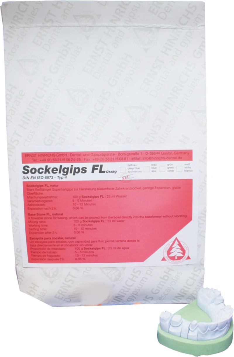 Ein fließfähiger Sockelgips, der aus dem Becher ohne zu vibrieren direkt in den Sockelformer gegossen werden kann. Sockelgips flüssig ist zum Sockeln aller Stumpf- und Zahnkranzarbeiten geeignet. Typ 4.