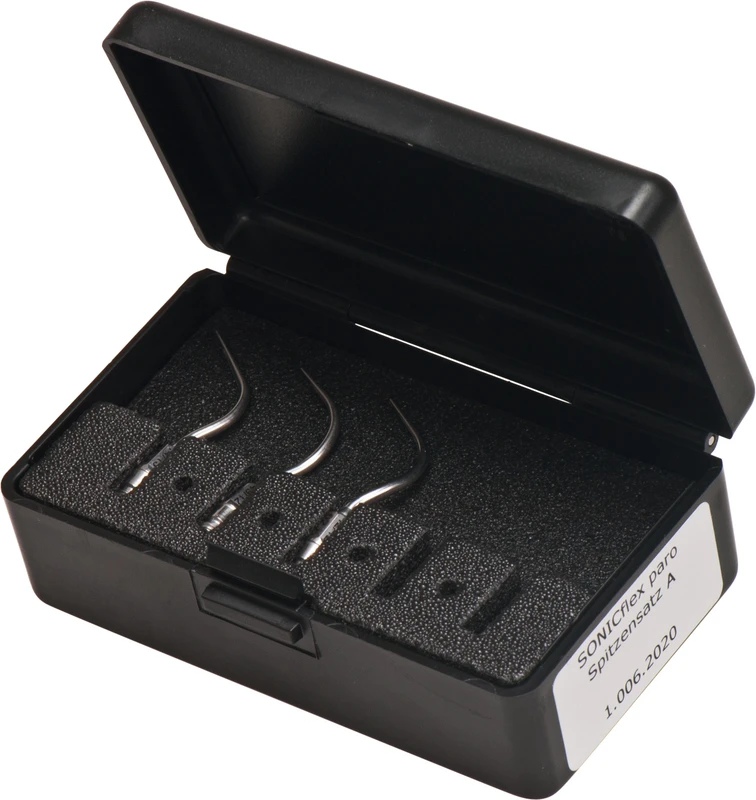 Lange, total abgerundete Spitzen gebogen in verschiedene axialen Richtungen für die ideale Erreichbarkeit aller Taschen in den entsprechenden Quadranten.Wichtiger Hinweis: Spitzen mit dem Zusatz "A" dürfen durch das kürzere Gewinde nur auf dem KaVo SONICflex quick 2008L/LS verwendet werden. Spitzen ohne die zusätzliche Kennzeichnung mit dem Buchstaben "A" dürfen nur auf dem KaVo SONICflex 2000N/L und 2003L/LX/NX verwendet werden.
