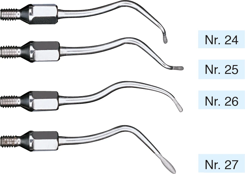 Diamantierte Spitzen verschieden gebogen für die ideale Erreichbarkeit der Wurzeloberflächen und Furkartionen nach Prof. Kocher.