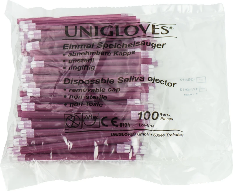Mit den Unigloves Speichelsauger kann man bei zahnärztlichen Behandlungen Flüssigkeiten wie Wasser, kleinere Abriebpartikel und Speichel ideal mit der aufgesetzten Schutzkappe absaugen. Auch das Absaugen von größeren Materialstücken oder Abriebpartikel können mittels Abnehmen der Schutzkappe genauso erfolgen. Der flexible Kunststoff kann mit dem integrierten Metalldraht in die gewünschte formstabile Einsatzform gebracht werden. Die belüftete Schutzkappe verhindert das festsaugen an der Mundschleimhaut. Auch unsere Speichelsauger gibt es in einer großen Auswahl an Farben.Unsterile Speichelsauger mit abnehmbarer Kappe.