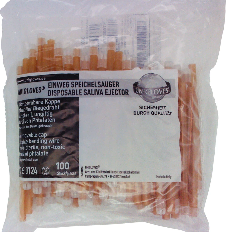 Mit den Unigloves Speichelsauger kann man bei zahnärztlichen Behandlungen Flüssigkeiten wie Wasser, kleinere Abriebpartikel und Speichel ideal mit der aufgesetzten Schutzkappe absaugen. Auch das Absaugen von größeren Materialstücken oder Abriebpartikel können mittels Abnehmen der Schutzkappe genauso erfolgen. Der flexible Kunststoff kann mit dem integrierten Metalldraht in die gewünschte formstabile Einsatzform gebracht werden. Die belüftete Schutzkappe verhindert das festsaugen an der Mundschleimhaut. Auch unsere Speichelsauger gibt es in einer großen Auswahl an Farben.Unsterile Speichelsauger mit abnehmbarer Kappe.
