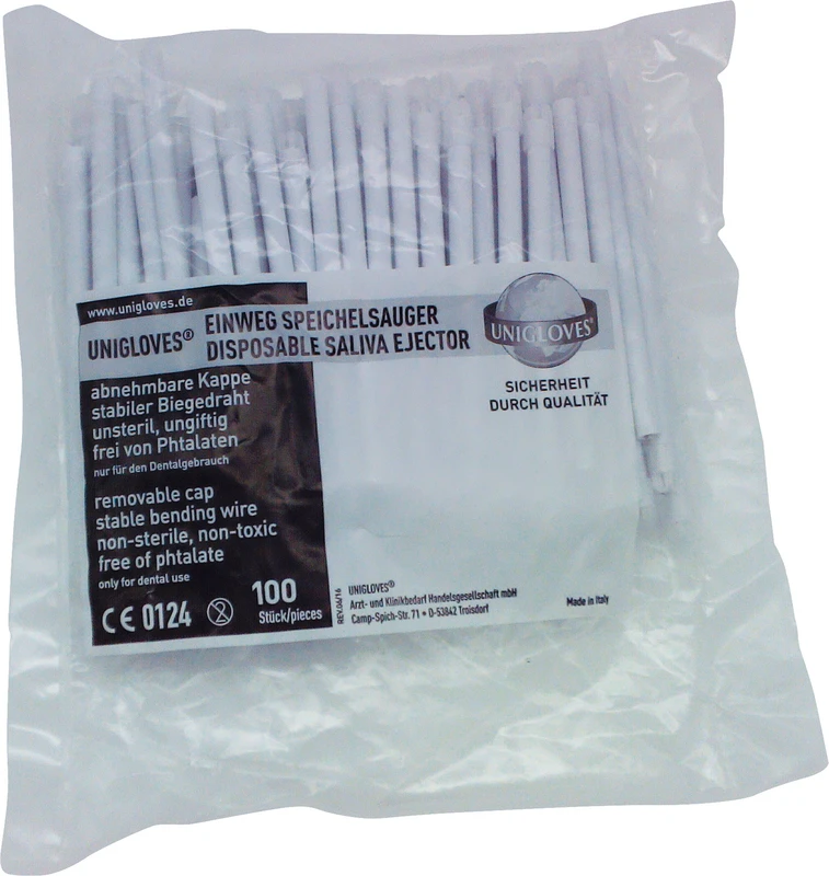 Mit den Unigloves Speichelsauger kann man bei zahnärztlichen Behandlungen Flüssigkeiten wie Wasser, kleinere Abriebpartikel und Speichel ideal mit der aufgesetzten Schutzkappe absaugen. Auch das Absaugen von größeren Materialstücken oder Abriebpartikel können mittels Abnehmen der Schutzkappe genauso erfolgen. Der flexible Kunststoff kann mit dem integrierten Metalldraht in die gewünschte formstabile Einsatzform gebracht werden. Die belüftete Schutzkappe verhindert das festsaugen an der Mundschleimhaut. Auch unsere Speichelsauger gibt es in einer großen Auswahl an Farben.Unsterile Speichelsauger mit abnehmbarer Kappe.