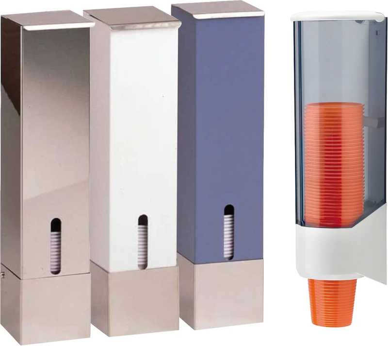 Aus Kunststoff, Metall oder Edelstahl mit Wandhalterung. Platz für 60 Becher bei Kunststoff- und 70 Becher bei Metallspender.