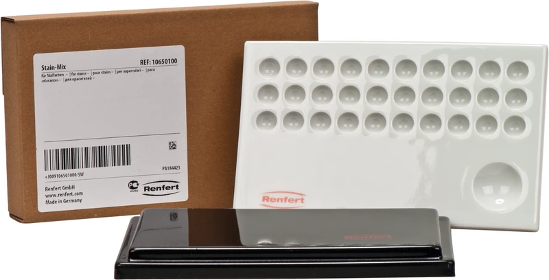 Keramikanmischplatte für Malfarben. 30 kleine Mulden für Malfarben. 1 große Mulde für Glasurmasse. Mit schwarzem Deckel für lichthärtende Malfarben geeignet.