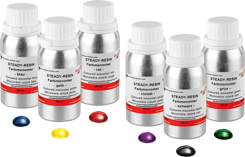 Gebrauchsfertige farbige STEADY-RESIN Monomere. Zur Verwendung mit STEADY-RESIN S, M und VARIO sowie DURASPLINT Polymer.