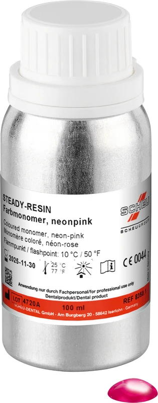 Gebrauchsfertige farbige Neonmonomere zur Verwendung mit STEADY-RESIN S, M und VARIO sowie DURASPLINT Polymer. Für schlierenfreie und transluzente Ergebnisse.