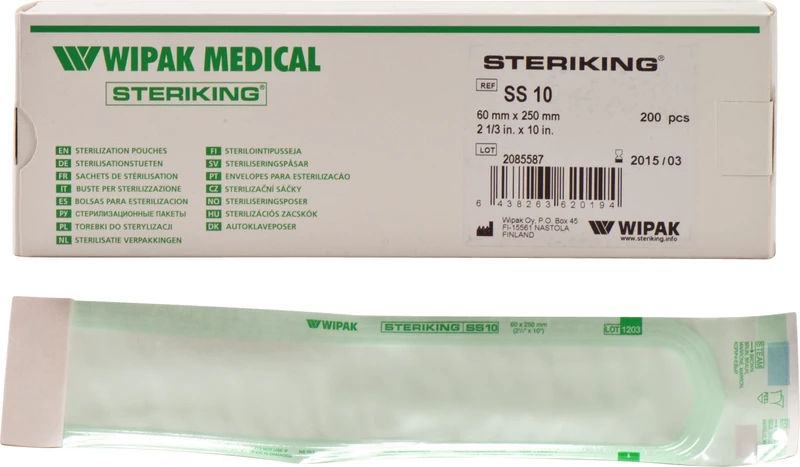 Sterilgutverpackung für die Dampf- und Gassterilisation. Kein Schweißgerät erforderlich. Medizinisches Spezialpapier. 9-schichtige Kunststoff-Folie für höchste Reißfestigkeit. Kontrollindikatoren für Dampf- und Gassterilisation aufgedruckt.