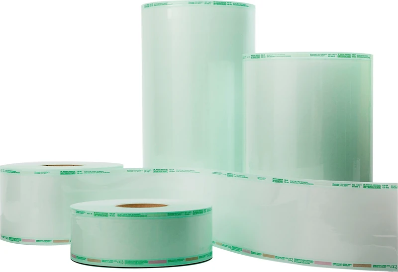 Sterilgutverpackung für die Dampf- und Gassterilisation. Medizinisches Spezialpapier. 9-schichtige Kunststoff-Folie für höchste Reißfestigkeit. Beim Versiegeln verfärbt sich die grüne Folie dunkler. Als Siegeltemperatur werden je nach Druck und Zeit 165 - 200 °C empfohlen.