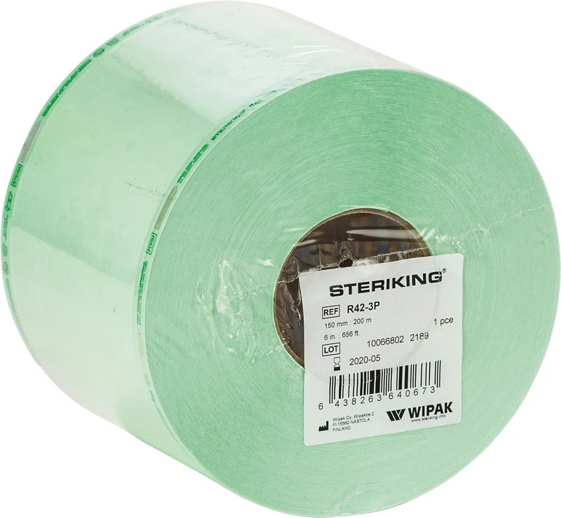 Sterilgutverpackung für die Dampf- und Gassterilisation. Medizinisches Spezialpapier. 9-schichtige Kunststoff-Folie für höchste Reißfestigkeit. Beim Versiegeln verfärbt sich die grüne Folie dunkler. Als Siegeltemperatur werden je nach Druck und Zeit 165 - 200 °C empfohlen.
