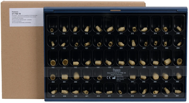 Sortiment 58 Kronen gängige Front- und Backenzähne sortiert (OK 111 116 / 120 124 / 131, 133 / 141 143 / 161, 162, OK 211 216 / 221 225 / 231, 233 / 241 243 / 261, 262, UK 311, 312 / 321, 322 / 330, 331 / 341, 342 / 360 362, UK 411, 412 / 421, 422 / 430, 431 / 441, 442 / 460 462)