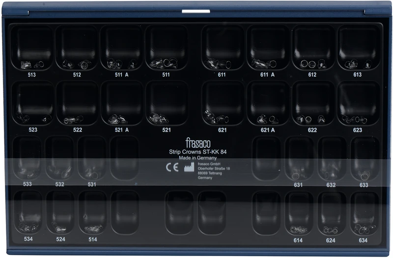 frasaco-Strip-Kronen sind dünn, elastisch, leicht zu beschneiden und in klarer Ausführung, lichtdurchlässig für Polymerisationslicht. Sie dienen als Formgeber, der temporären Versorgung beschliffener Zähne, dem Schutze großer Füllungen sowie als Matrize für Ecken- und Kantenaufbauten. Das Aufsetzen erfolgt mit den üblichen provisorischen Füllungsmaterialien.