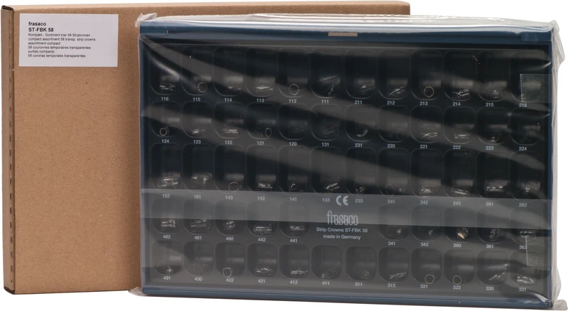 frasaco Strip-Kronen sind dünn, elastisch, leicht zu beschneiden und in klarer Ausführung, lichtdurchlässig für Polymerisationslicht. Sie dienen als Formgeber, der temporären Versorgung beschliffener Zähne, dem Schutze großer Füllungen sowie als Matrize für Ecken- und Kantenaufbauten. Das Aufsetzen erfolgt mit den üblichen provisorischen Füllungsmaterialien.