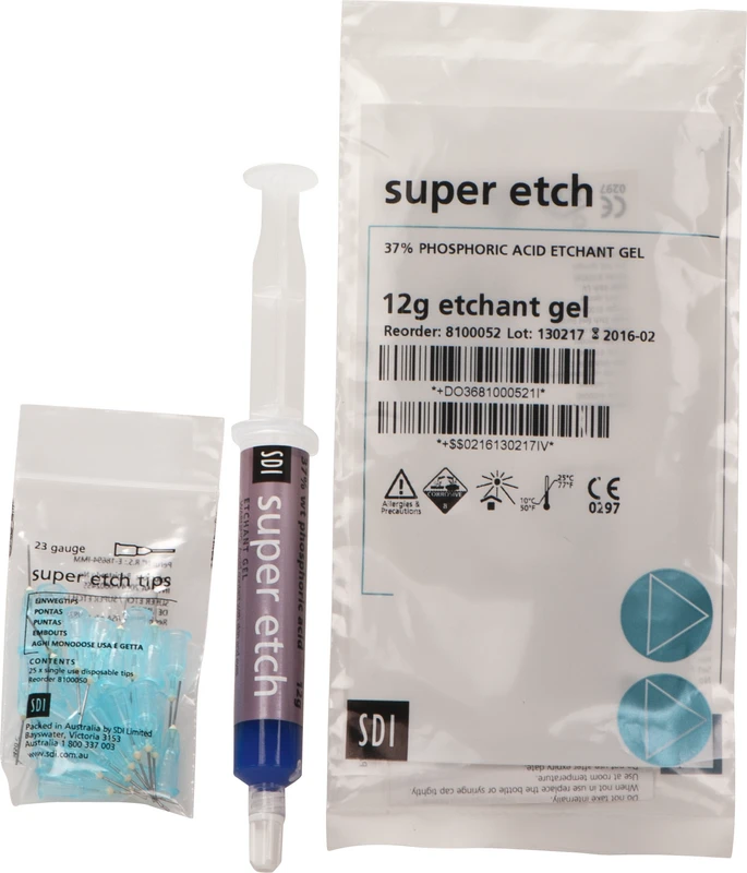 37 % Phosphorsäure. Blaues, tixotrophes Gel. Keine Beeinträchtigung des Adhäsivs. Auswahl an niedriger und hoher Viskosität. Schafft Mikroporen an der Schmelzoberfläche und entfernt die Schmierschicht um die Tubuli frei zu legen.